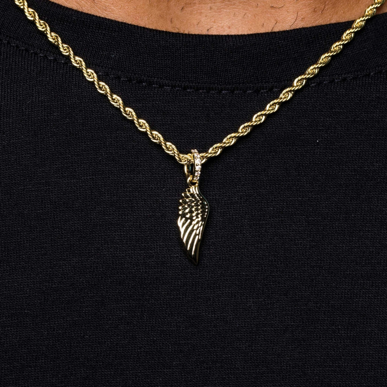 Introducing the “Micro Wing Pendant in Yellow Gold” this plain gold wing comes with an iced out bail. This pendant is a great staple piece for everyday and looks great paired with our classic “2mm Rope Chain In Yellow Gold”. It’s perfect to wear alone or layered with other chains and pendants.