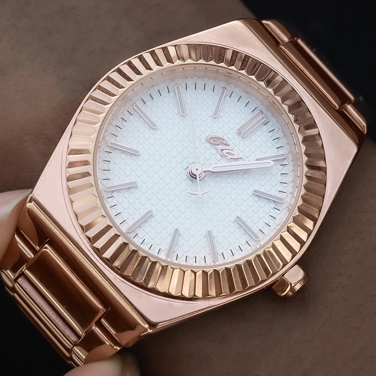It’s your time! Introducing the Fluted Bezel Alpha Era in Rose Gold, the latest addition to our exclusive GLD watches. This 316L Stainless Steel watch features a 36mm case, stainless steel band, white analog dial and roman numeral indices. Wear it as an everyday piece, this watch is sure to elevate your look day or night!