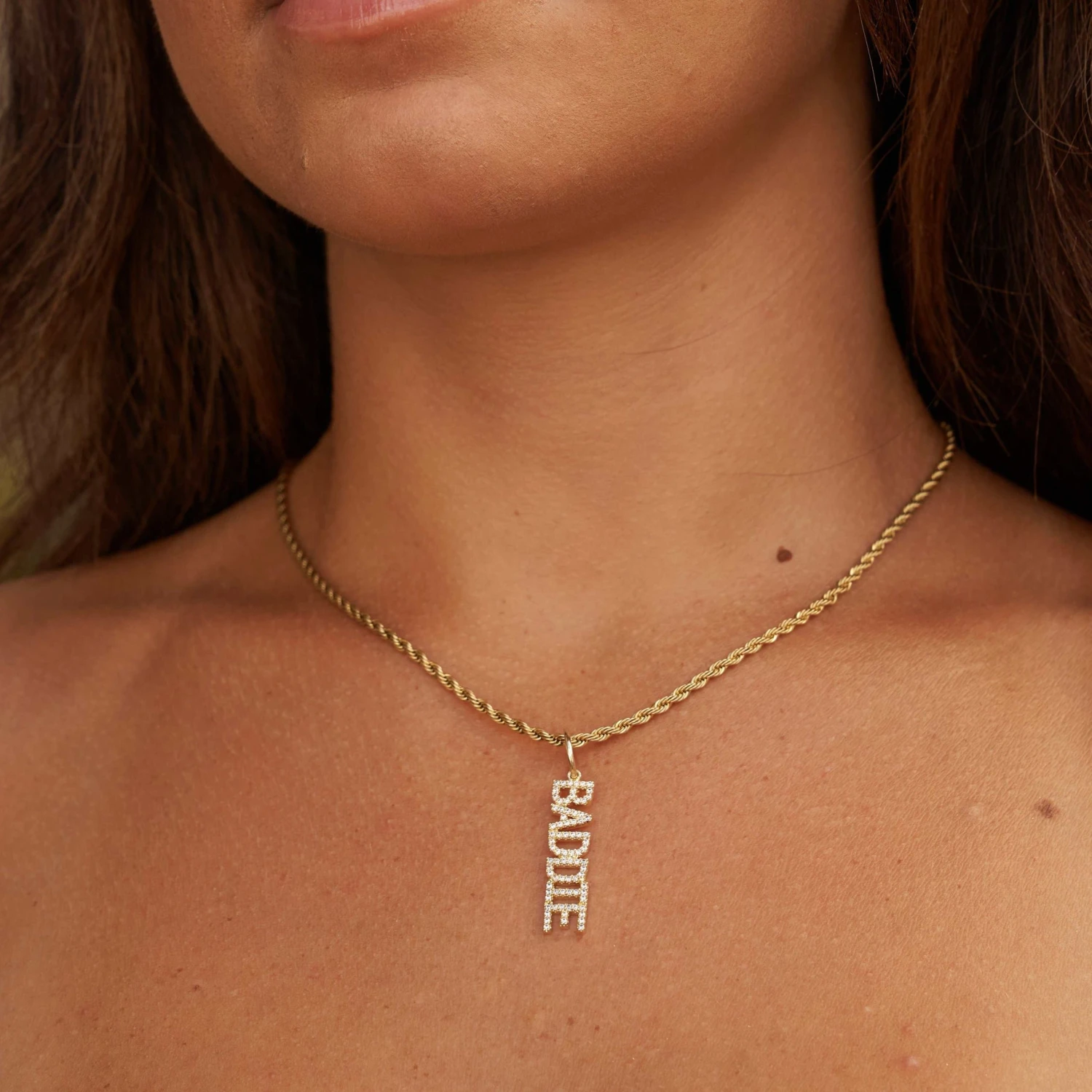Introducing our “Baddie” Pendant, a new way to accessorize your necklaces this season. This 18k Gold plated pendant is covered in clear hand-set stones all throughout the letters. Rock this piece like a baddie and pair it with our 2mm Rope Necklace for the perfect match!