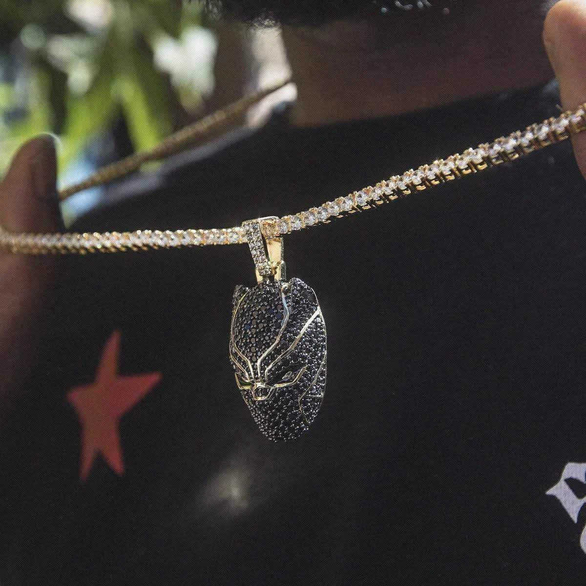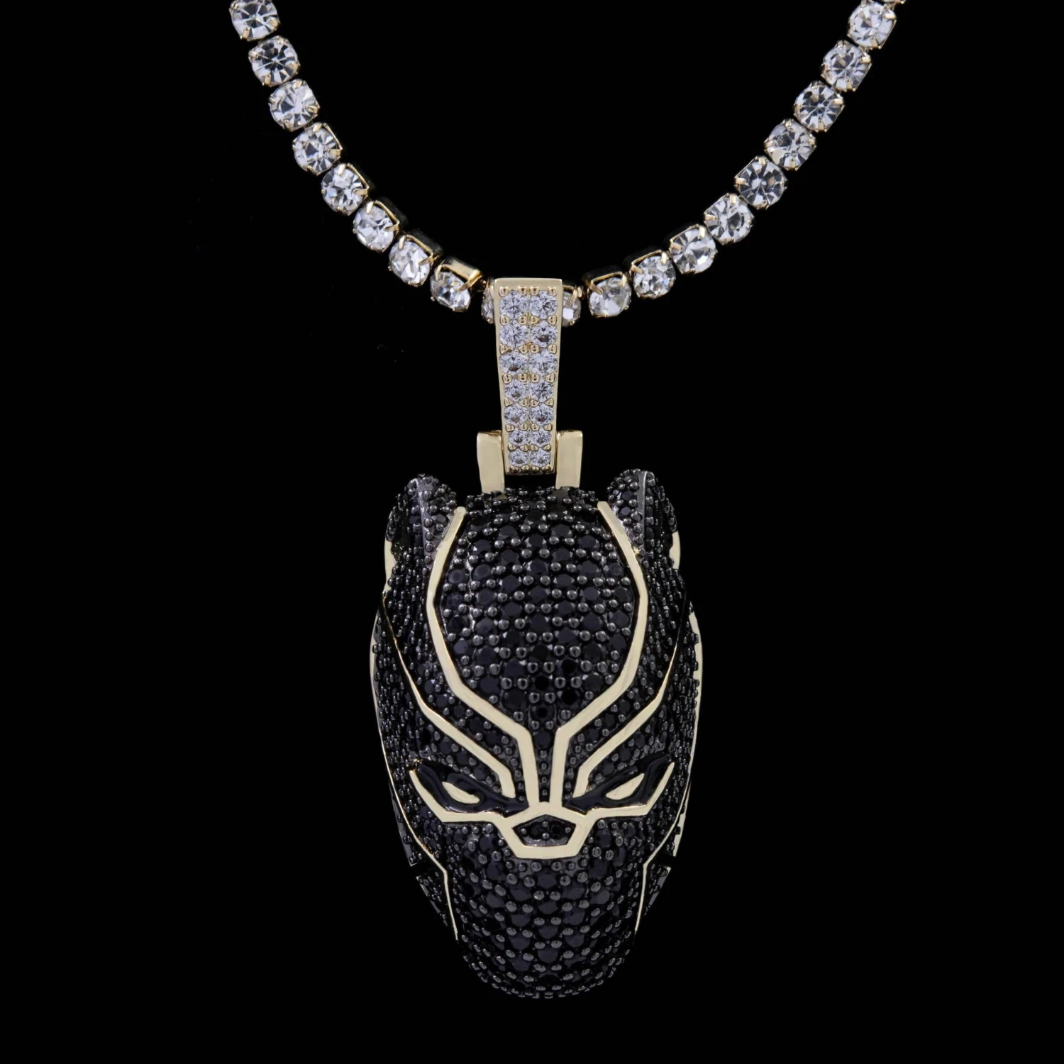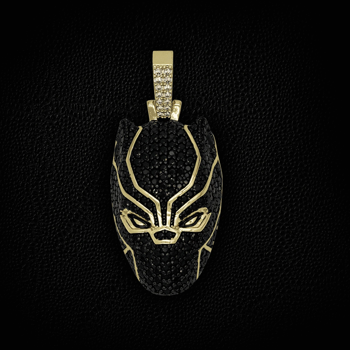 Introducing the Official pendants of the MARVEL Universe. This iconic piece is fit for a true king. Flooded in hand-set black round cut stones, finished in 18k Gold Plating, this pendant is crafted to accurately depict King T’Challa himself. Honor the spirit of “Wakanda Forever!” with the official Black Panther Pendant.