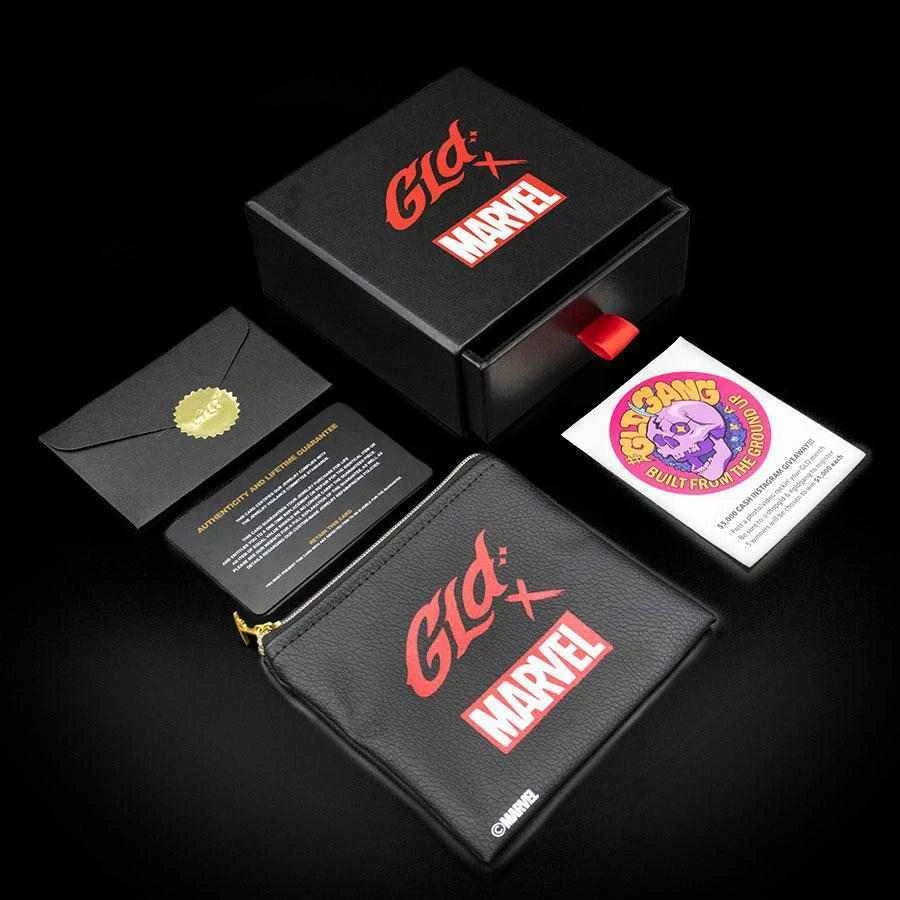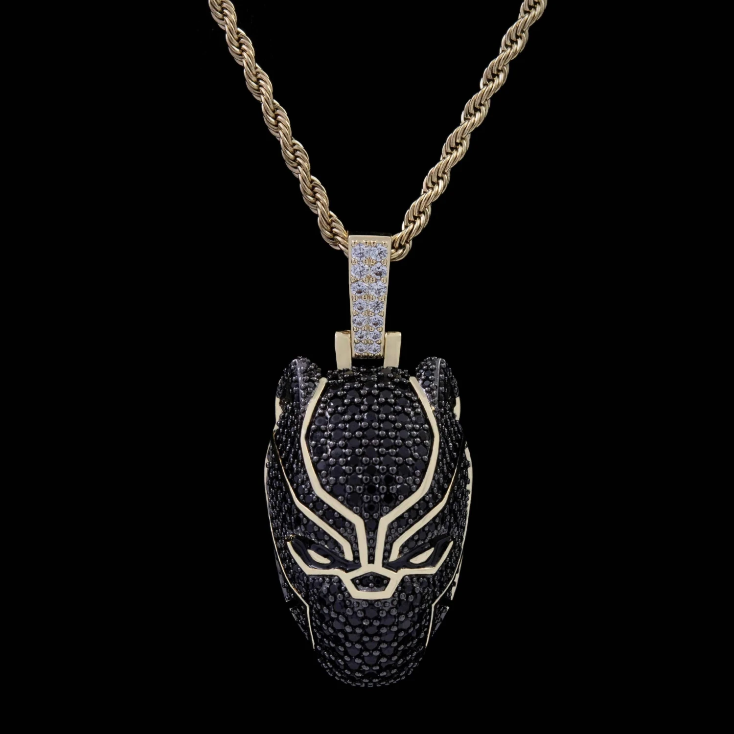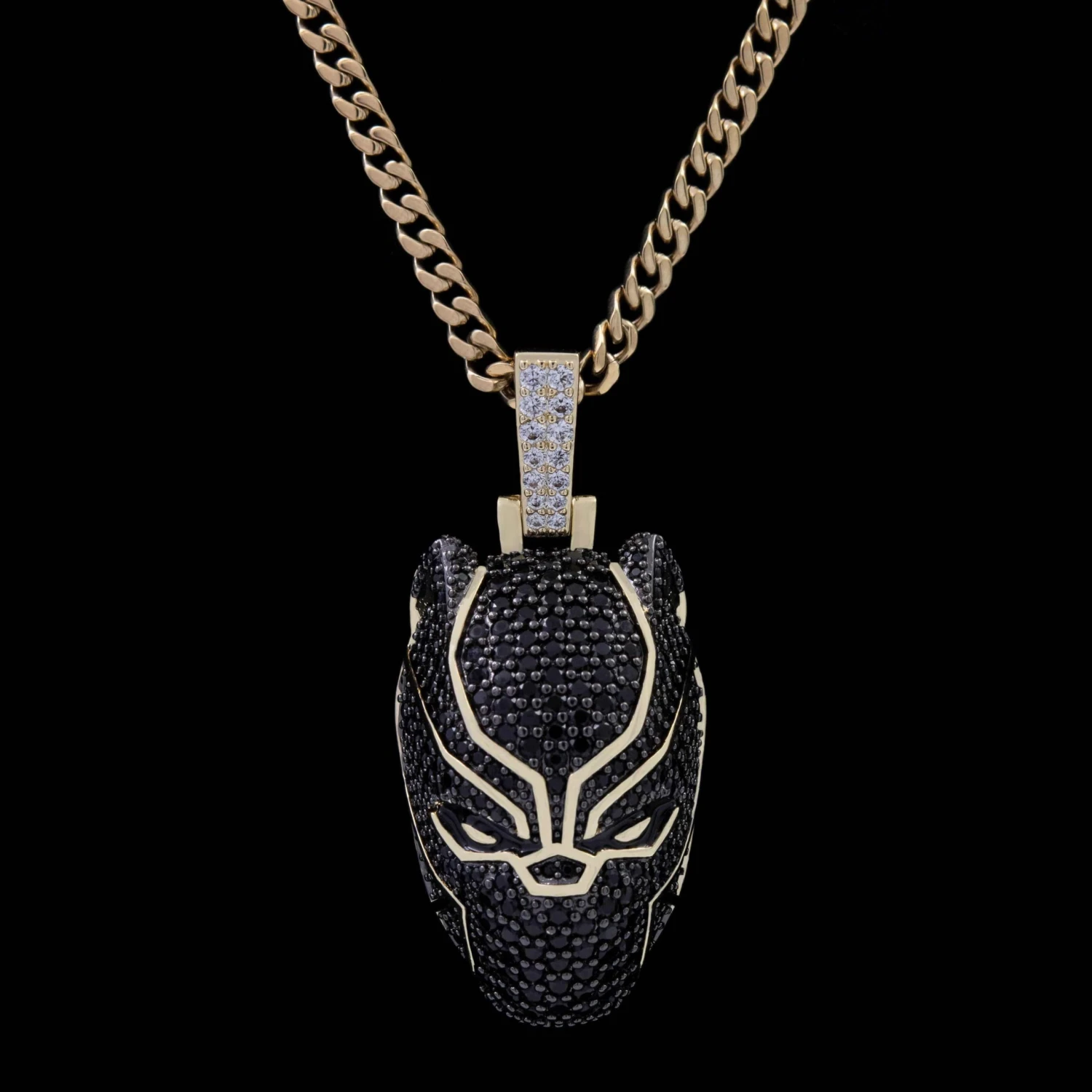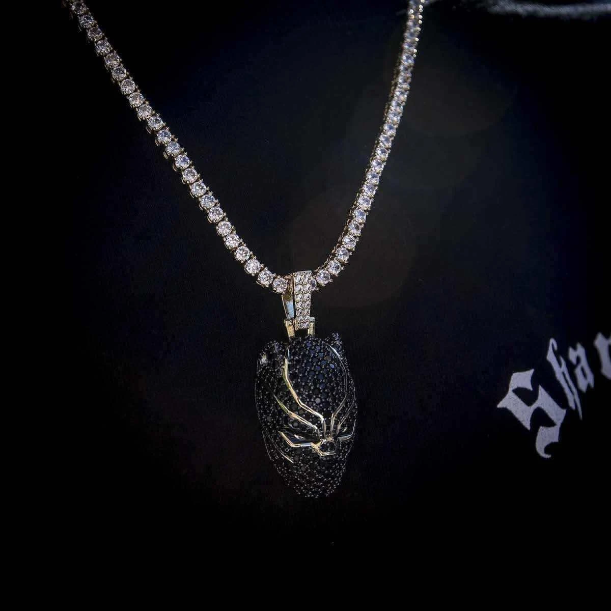 Introducing the Official pendants of the MARVEL Universe. This iconic piece is fit for a true king. Flooded in hand-set black round cut stones, finished in 18k Gold Plating, this pendant is crafted to accurately depict King T’Challa himself. Honor the spirit of “Wakanda Forever!” with the official Black Panther Pendant.