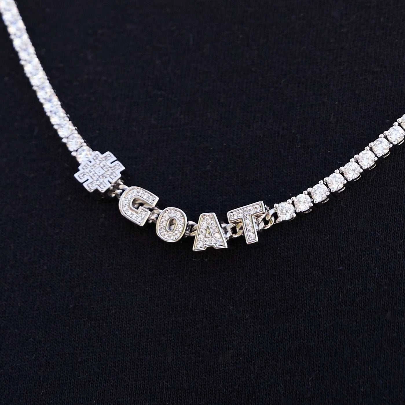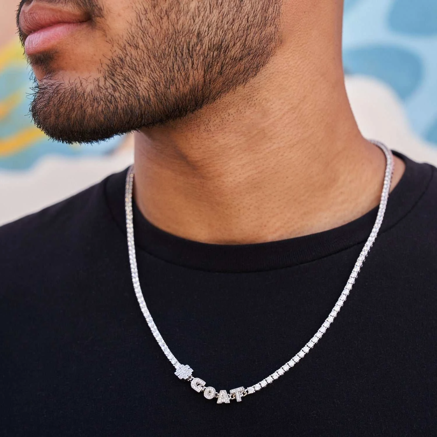 Introducing the Custom Stationed Tennis Chain, our classic tennis that is customizable. This iced out piece can be personalized with any letters, numbers, or symbols of your choice. Personalize a name, important date, or your favorite phrase! Decorate one or two separate words as you please in either 14k White Gold or 18k Yellow Gold.