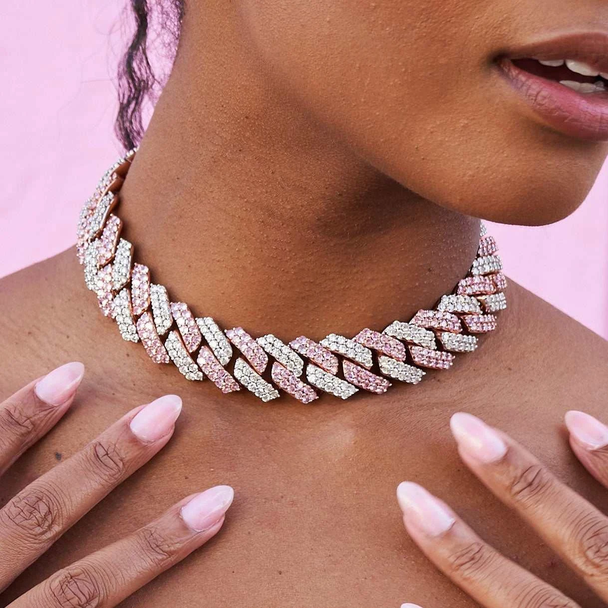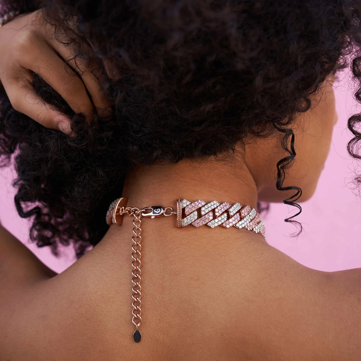 Introducing our Diamond Cuban Prong Choker in Rose/White Gold- 19mm. This 14k white and rose gold plated necklace features iced out prong links connecting throughout. This chain is adjustable, making it easy to style as a choker or longer chain. Paired with the Double Stone Ring, it’s guaranteed to impress.