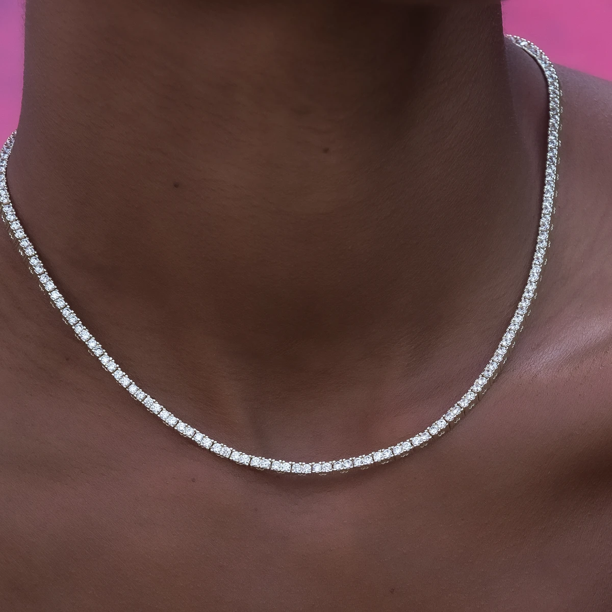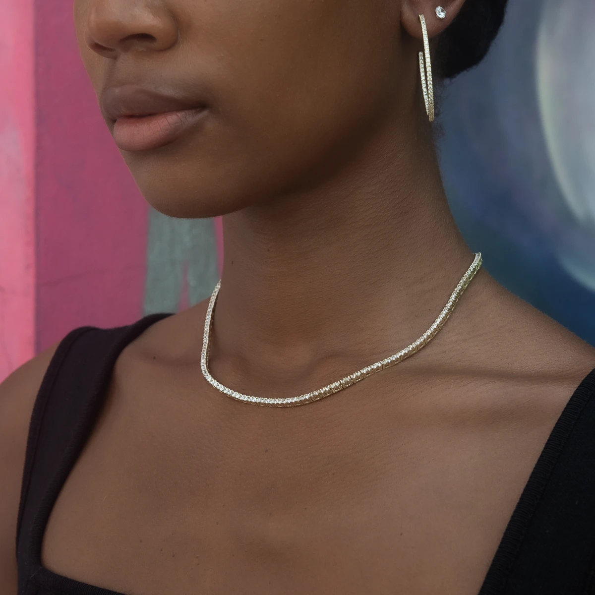 Introducing the Round Cut Tennis Necklace in 2mm, the perfect blend of simplicity and ultimate shine. This updated version of your everyday chain features a row of hand-set stones plated in 18k Yellow Gold and finished with our signature GLD clasp. Wear it for any occasion on its own, or layer two together to take your outfit to the next level!