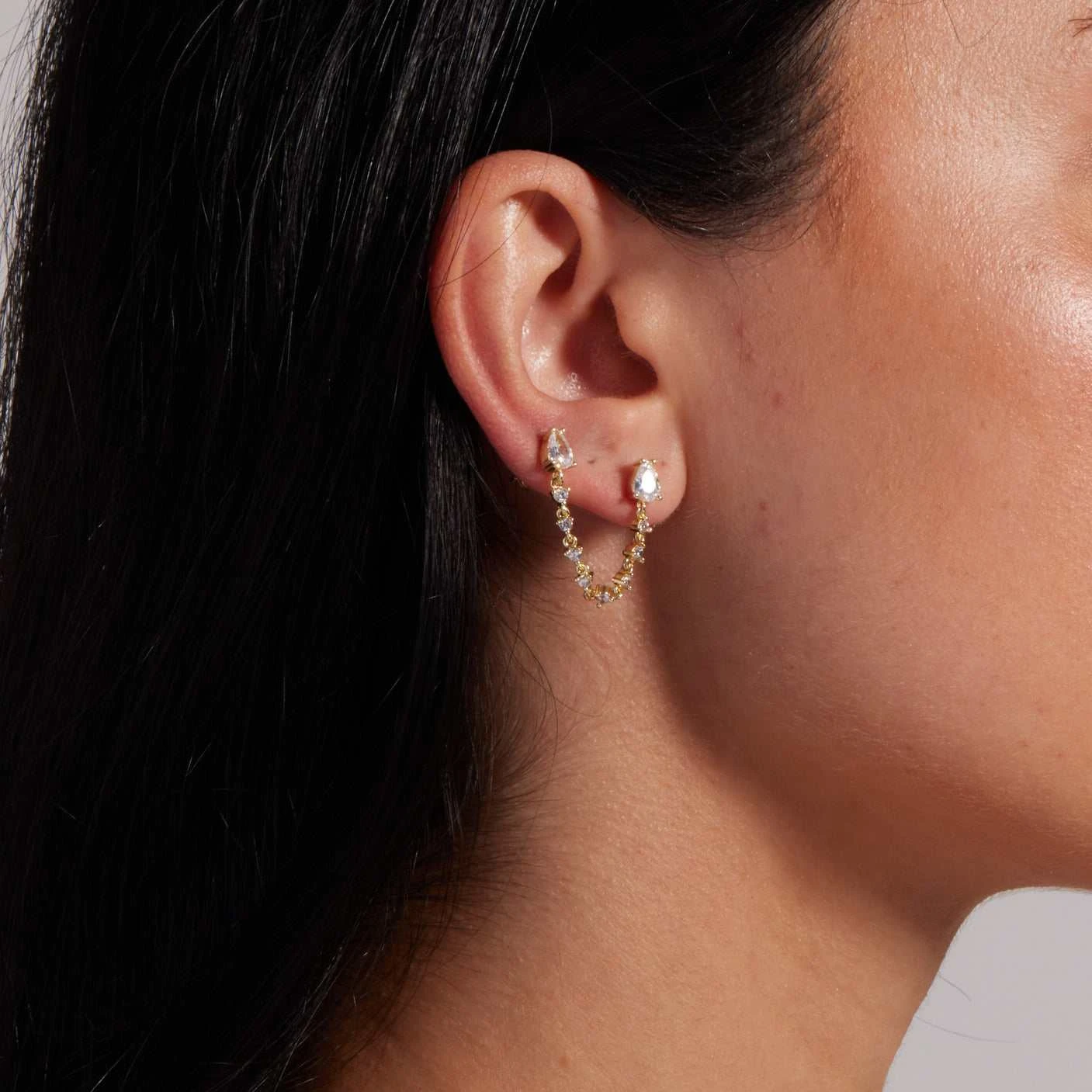 Introducing the Iced Chain Connected Tear Drop Earring, a fun new way to style multiple piercings. This single earring features two identical teardrop studs with a fully iced out chain connecting them. Paired with the Eternity Ear Cuff, they make a perfect match and edgy combination for any occasion.