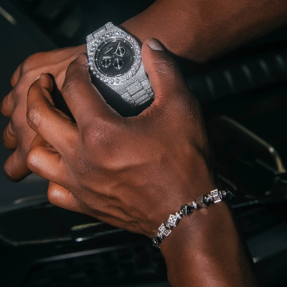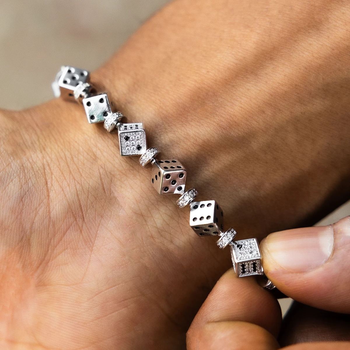 Introducing the Iced Dice Bracelet, this one’s an easy bet. Featuring iced die and roundels in 14k White Gold around an elastic band for easy on and off. So go ahead, roll the dice, and bring an edge to your style with this GLD exclusive. Pair it with the Dice Stud Earrings for a perfect set!
