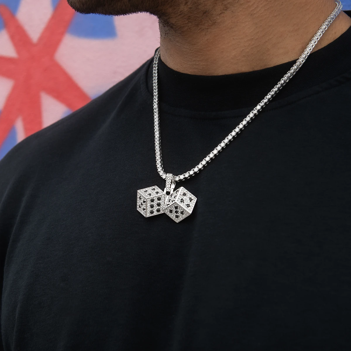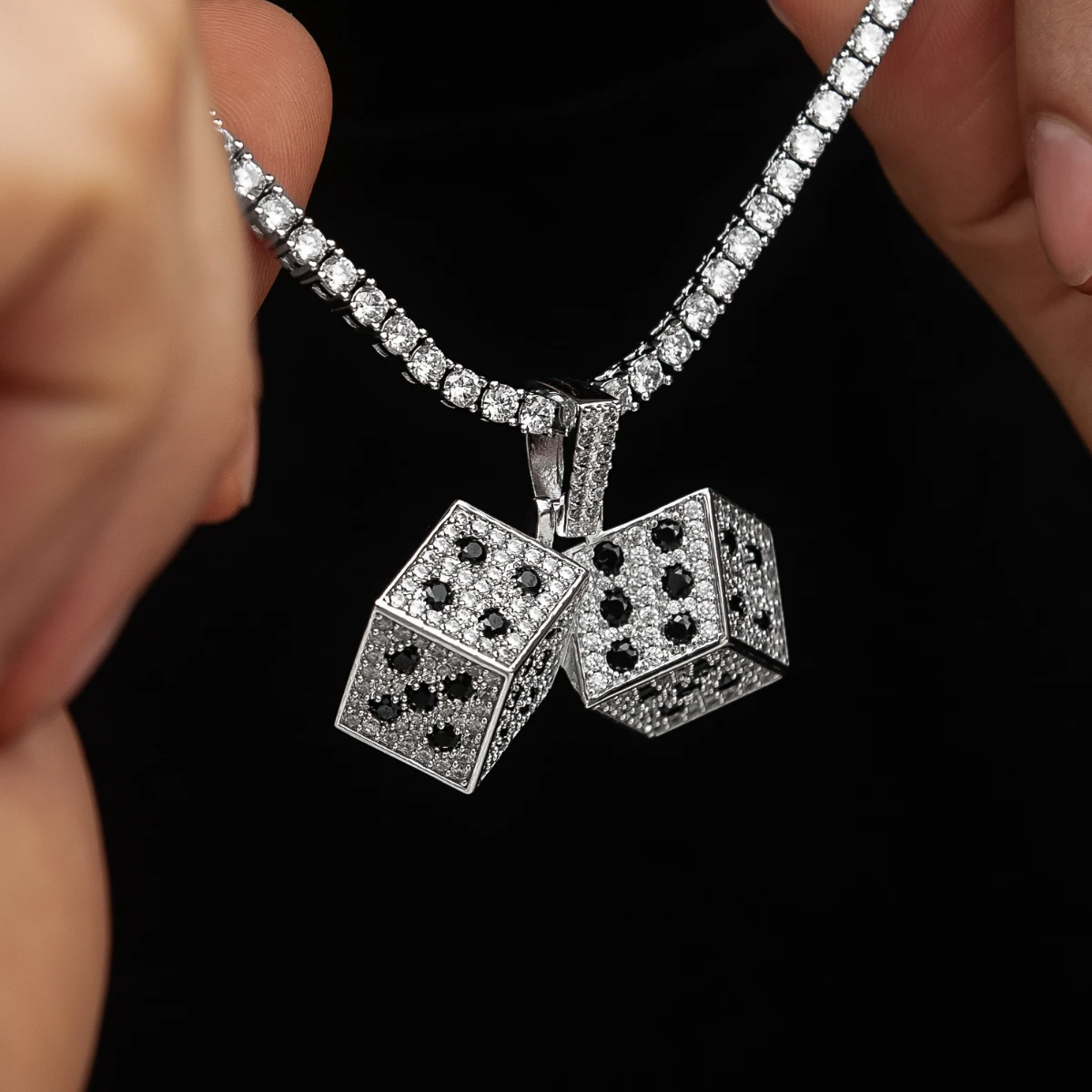 Introducing the star of our Dice Collection, the Iced Dice Pendant in 14k White Gold. This GLD exclusive features an iced out pair of dice, carefully crafted to appear 3D and decked out in hand-set stones for unparalleled shine. Pair it with the 5mm Tennis Chain to make a great set, this statement piece is a gamble you’ll always win!