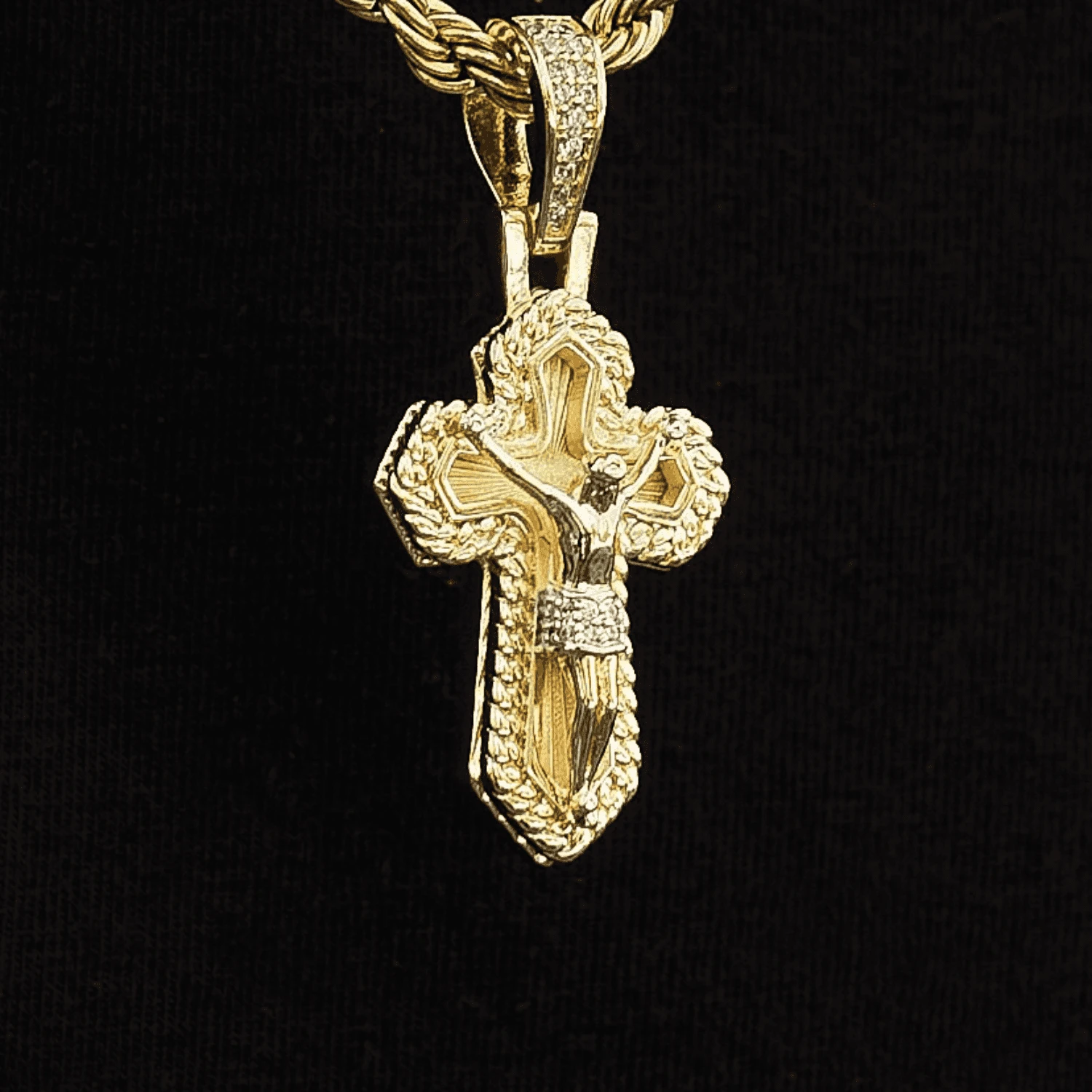 Introducing the Icon Cross Pendant, an 18k Gold Plated statement piece featuring Jesus Christ crucified on the cross. Outlined in an intricate textured border with a hollow detailed center, this piece is one of a kind and pairs perfectly with the 4mm Rope Chain pictured here.