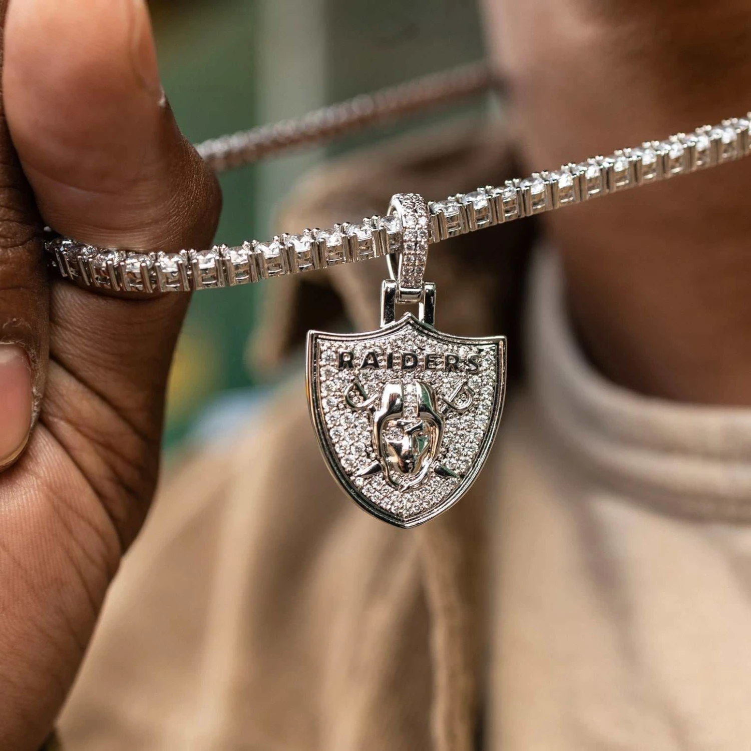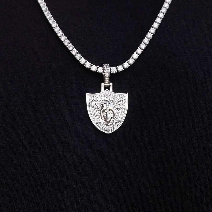 GLD has teamed up with the National Football League to introduce the official NFL Micro Logo Pendants. This piece was meticulously crafted with 14k white gold and clear hand-set stones to accurately depict the logo of the Raiders. Flex this NFL season with the official pendant of the Las Vegas Raiders.