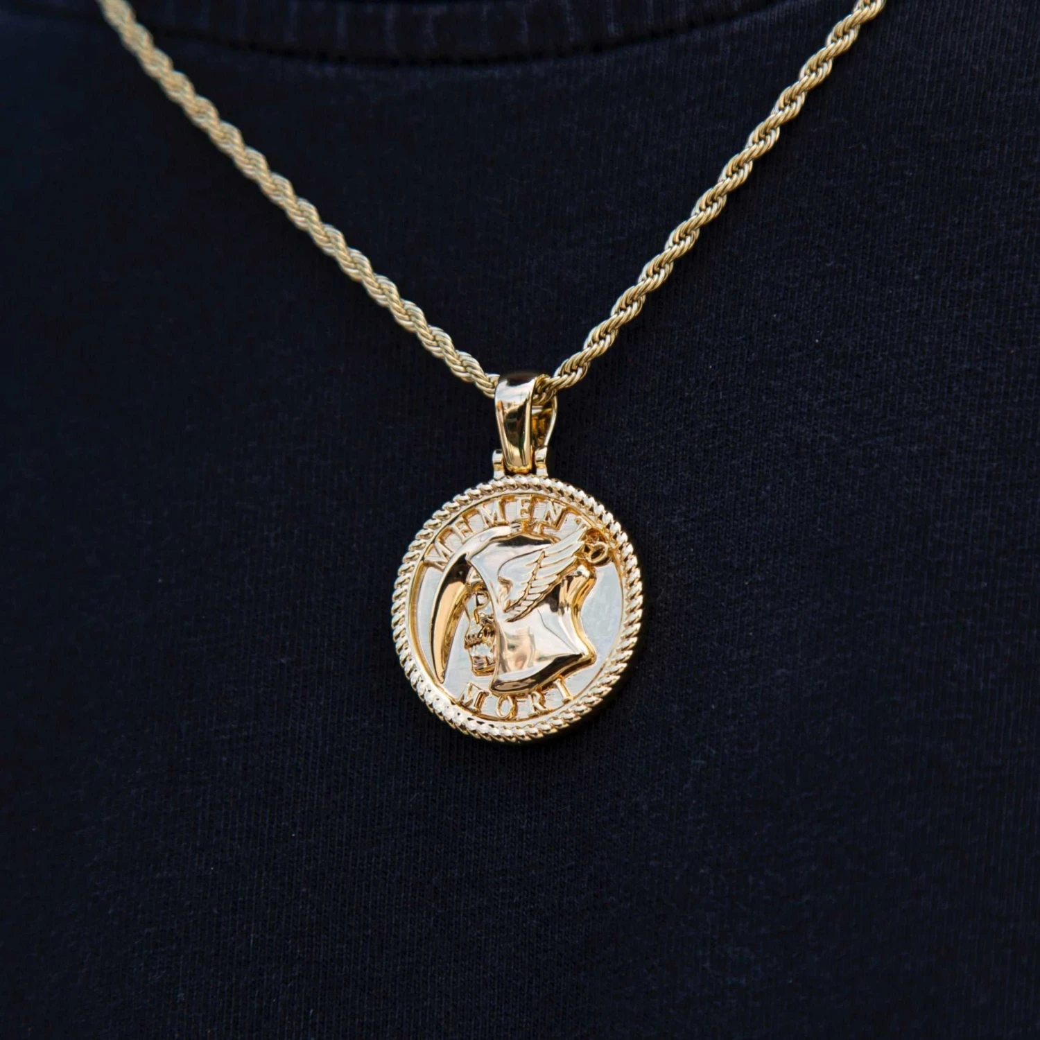 Introducing the “Memento Mori Coin Pendant” inspired by the latin phrase ” Remember you will die”. This gold coin pendant is a great staple piece, you can pair this with any of our classic chains. In this picture we see it is paired with our “2mm Rope Chain In Yellow Gold” for a classic look that can be worn alone or styled with other layered chains.