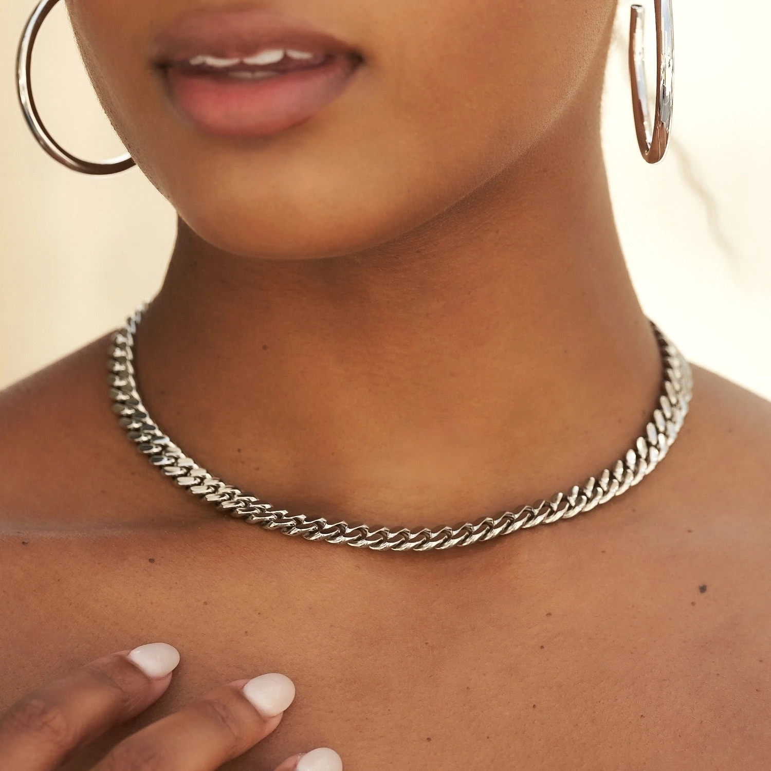 Introducing our 8mm Miami Cuban Link Necklace in White Gold, this is a classic chain that will quickly become a must-have in your collection. This white gold polish over stainless steel piece is the perfect medium size for everyday wear and features our signature GLD clasp. The 8mm Cuban Link seamlessly layers with other chains and perfectly pairs with the 8mm Cuban Link Bracelet in White Gold.