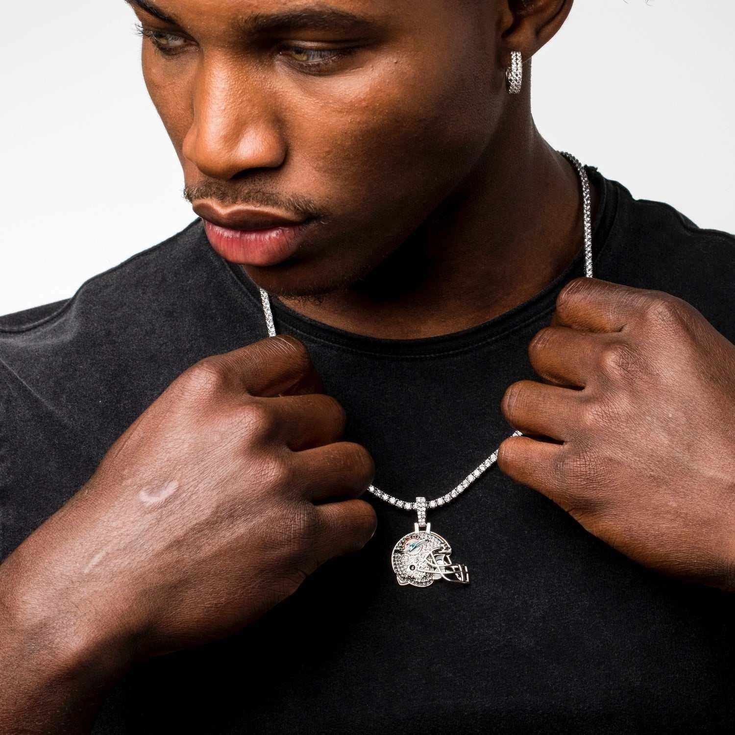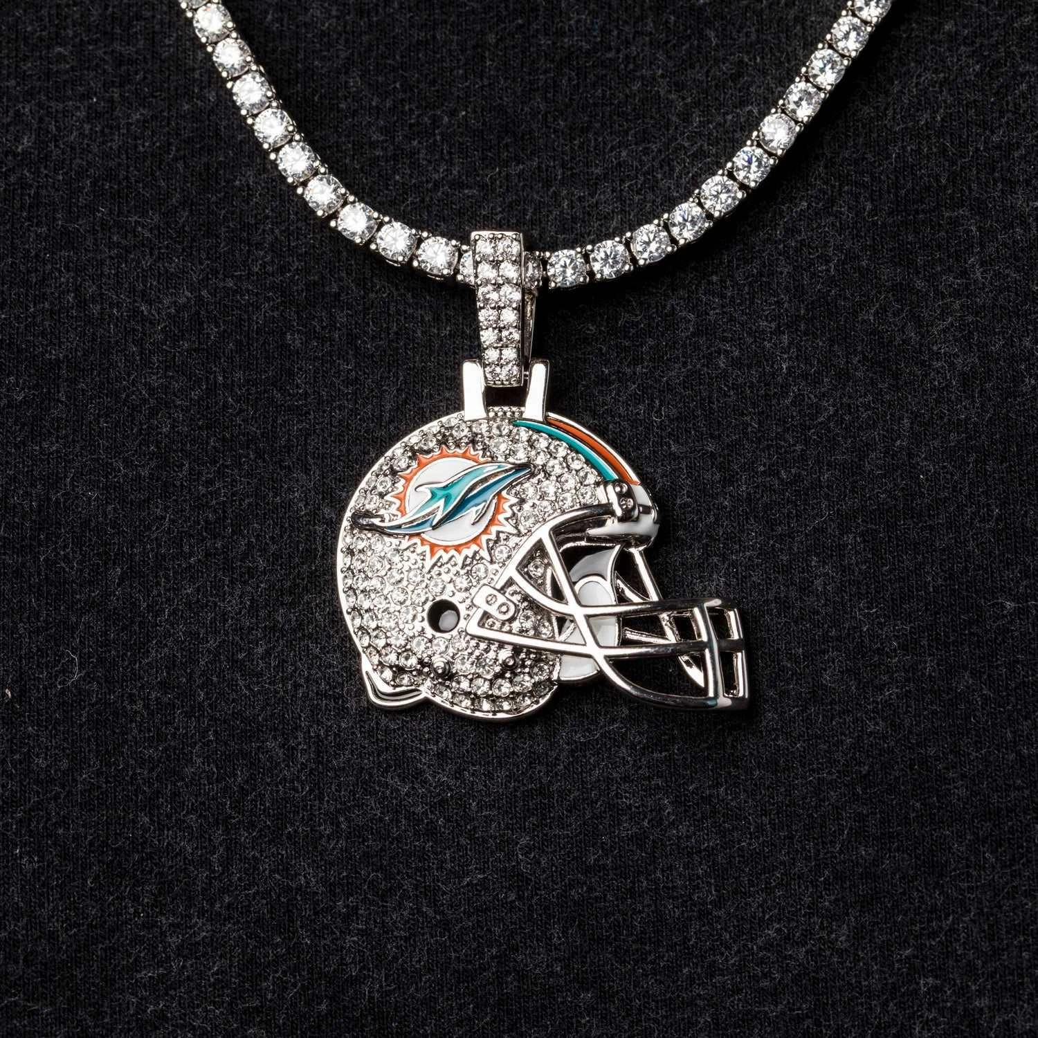 GLD has teamed up with the National Football League to introduce the official NFL Team Helmet Pendants. This piece was meticulously crafted with clear hand-set stones, teal and orange enamel to accurately depict the helmets of the Dolphins. Flex this NFL season with the official pendant of the Miami Dolphins!