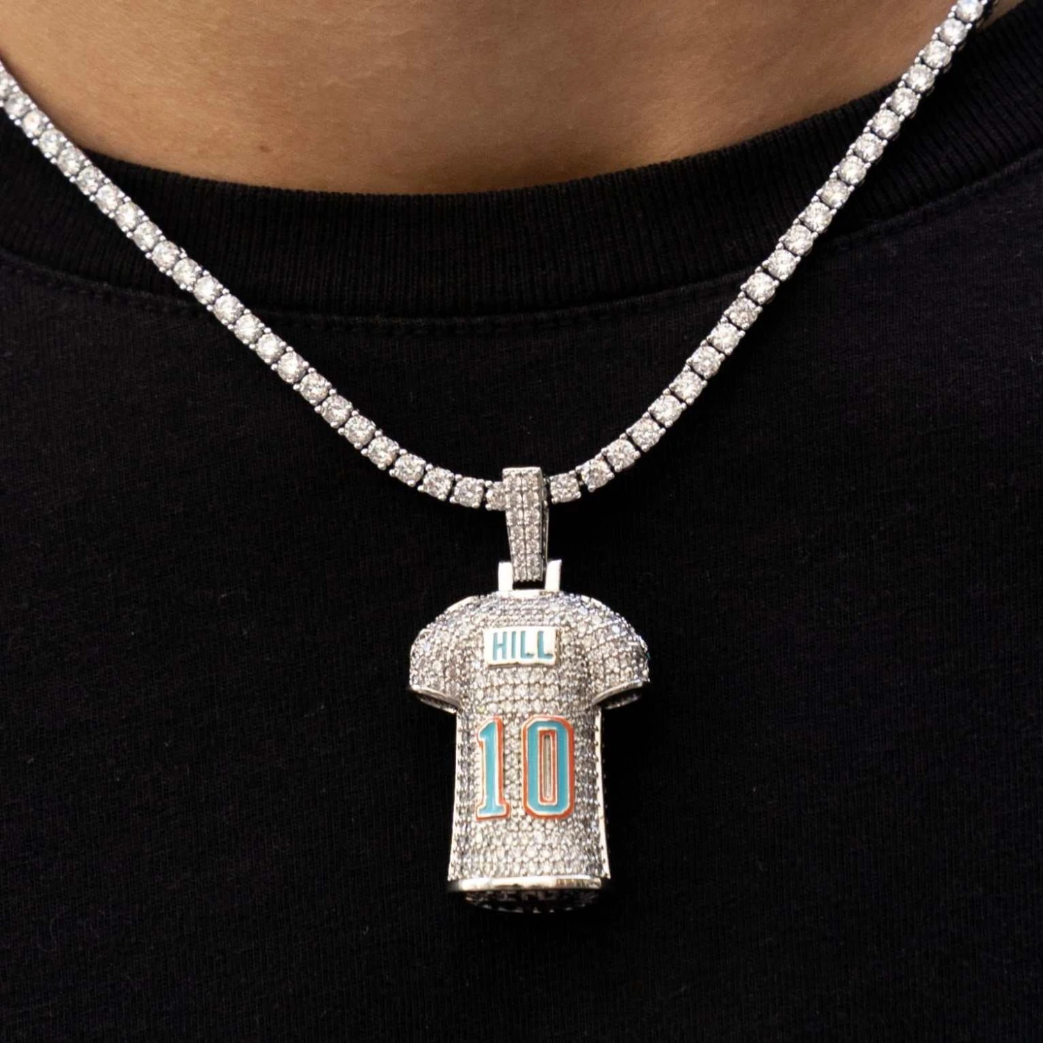 Introducing the Miami Dolphins Tyreek Hill Jersey Pendant. GLD has teamed up with the National Football League to introduce the official NFL Sculpted Jersey Pendant. Tyreek Hill currently plays wide receiver for the Dolphins and is widely recognized for his speed, obtaining the nickname “Cheetah”. This piece was meticulously crafted with clear CZ stones and 14k White Gold plating to accurately depict the real life jersey of the Miami Dolphins. Flex your favorite player this season with the official #10 pendant!
