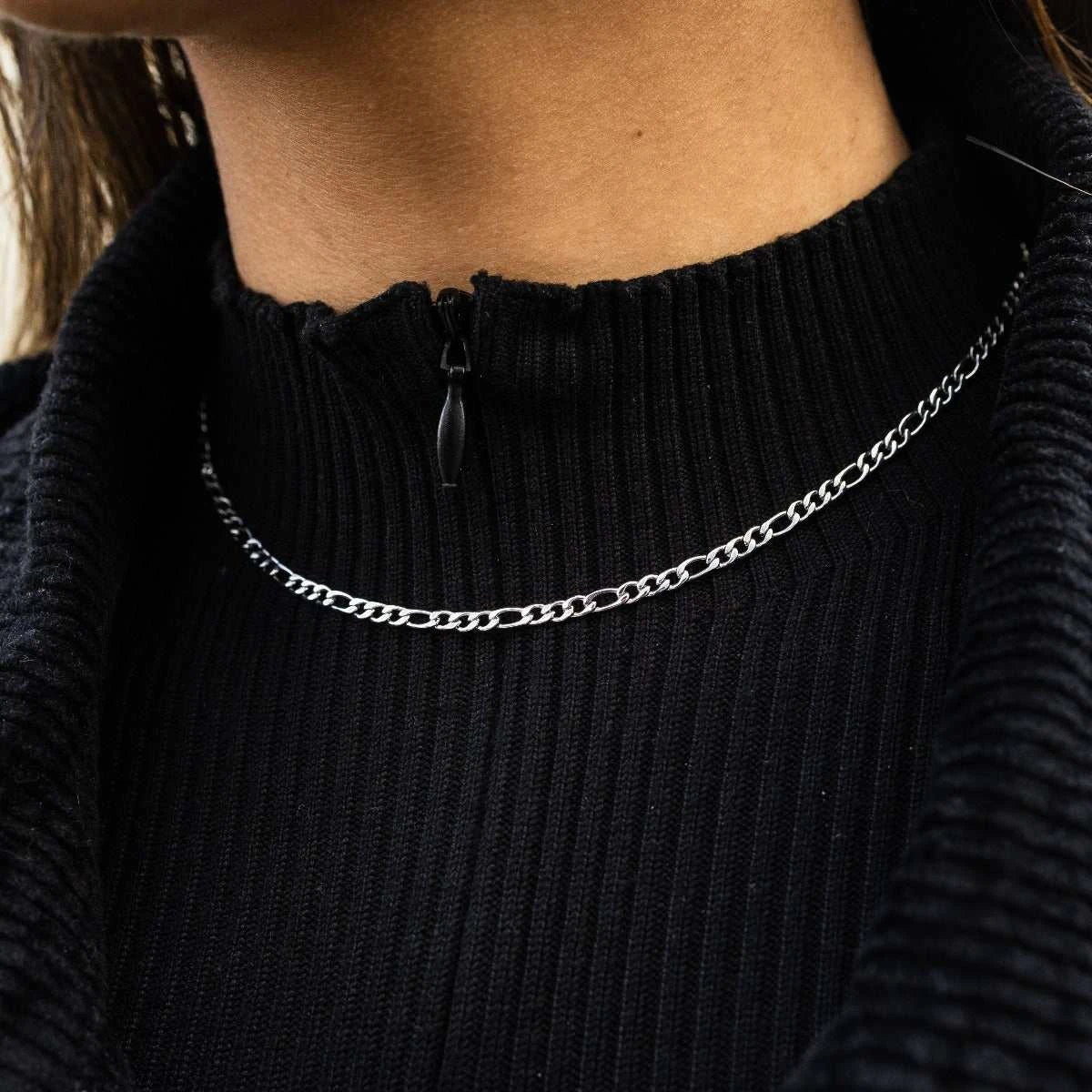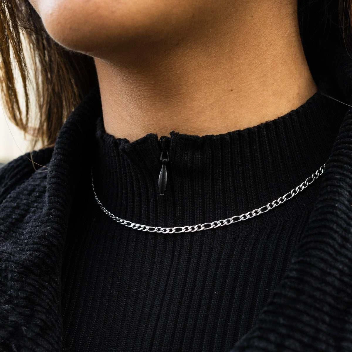 Introducing the Micro Figaro Necklace in White Gold. This classic chain is made up of flat links which follow a fun pattern of tighter links mixed in with wider links. A small size chain for every day, looks great paired with the Herringbone Necklace.