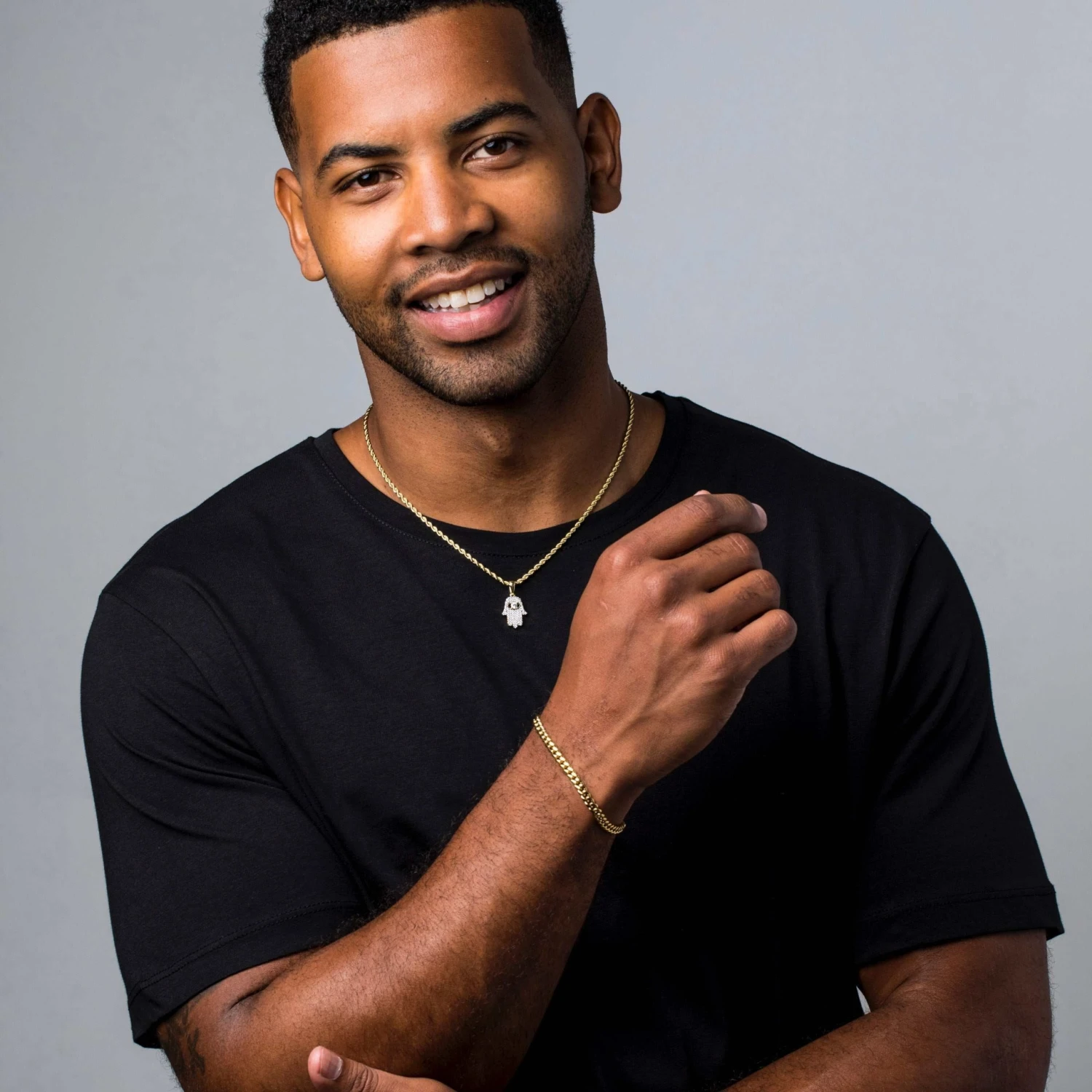 Introducing our “Micro Iced Hamsah Pendant in Yellow Gold” , this pendant has the Hamsah turned down which symbolizes the welcoming of blessings. This piece is fully iced out with a statement stone right on the center of the eye. Style this piece with our “4mm Rope Chain In Yellow Gold” for the perfect pair!