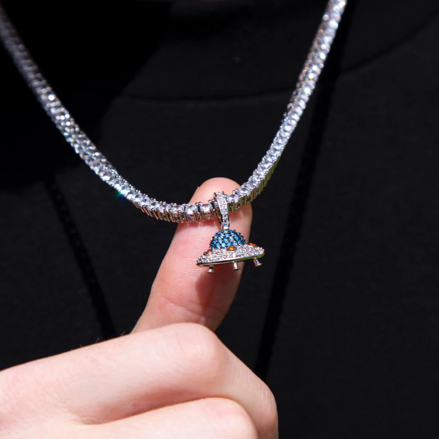 The Micro UFO Pendant is sure to stand out. With blue stones for the dome and red stones to add that extra shine to the iced out saucer. This unidentified flying object is sure to be your go to piece this season. Boss up and flex with the GLD gang!