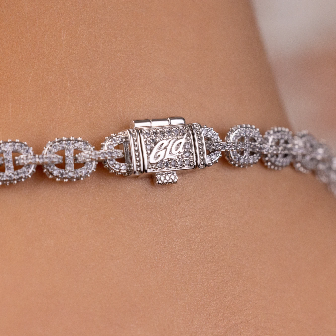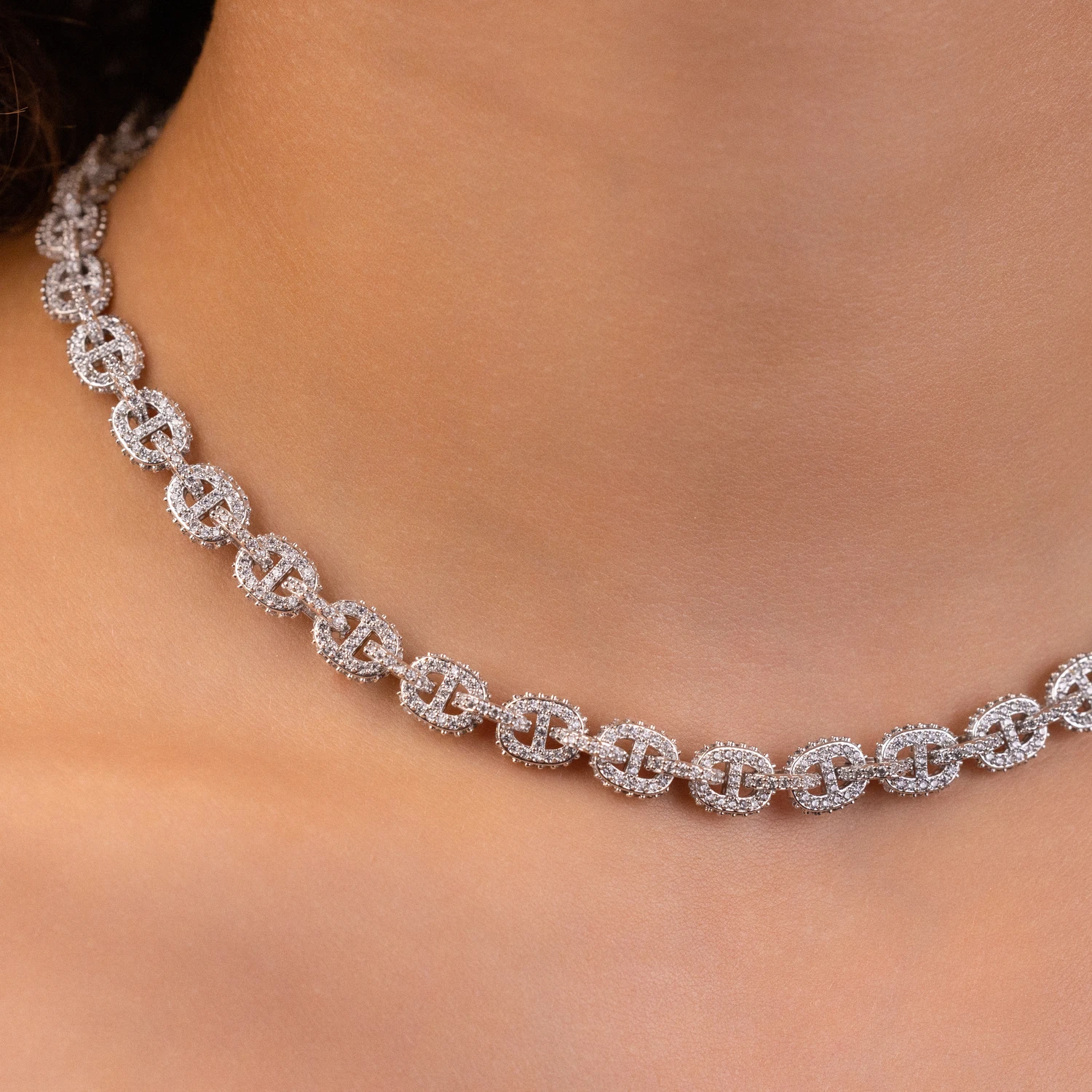 Introducing the Micro Valentina Necklace in White Gold, these connected valentina links are fully iced in pave hand-set stones, designed to catch the light from every direction. Pair this 14k White Gold Plated chain with the matching Micro Valentina Bracelet for the perfect set!