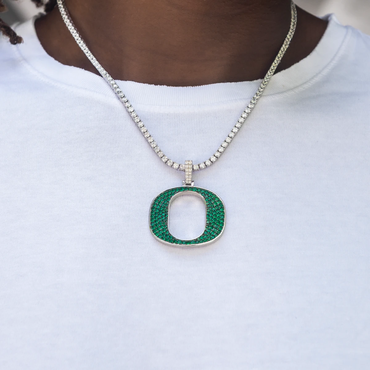 GLD has teamed up with the National Collegiate Athletic Association to introduce the official NCAA Team Pendants. This 14k White Gold piece was meticulously crafted with green hand-set stones to accurately depict the Oregon Ducks “O” Team Logo. Rep your squad with this official pendant to ‘Win The Day!’