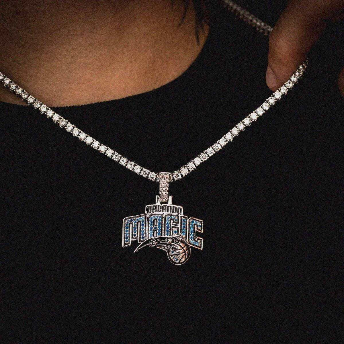 GLD has teamed up with the NBA to introduce the official NBA Team Pendants. This piece was meticulously crafted with clear and blue hand-set stones to accurately depict this logo. Flex this NBA season with the official pendant of the Orlando Magic.