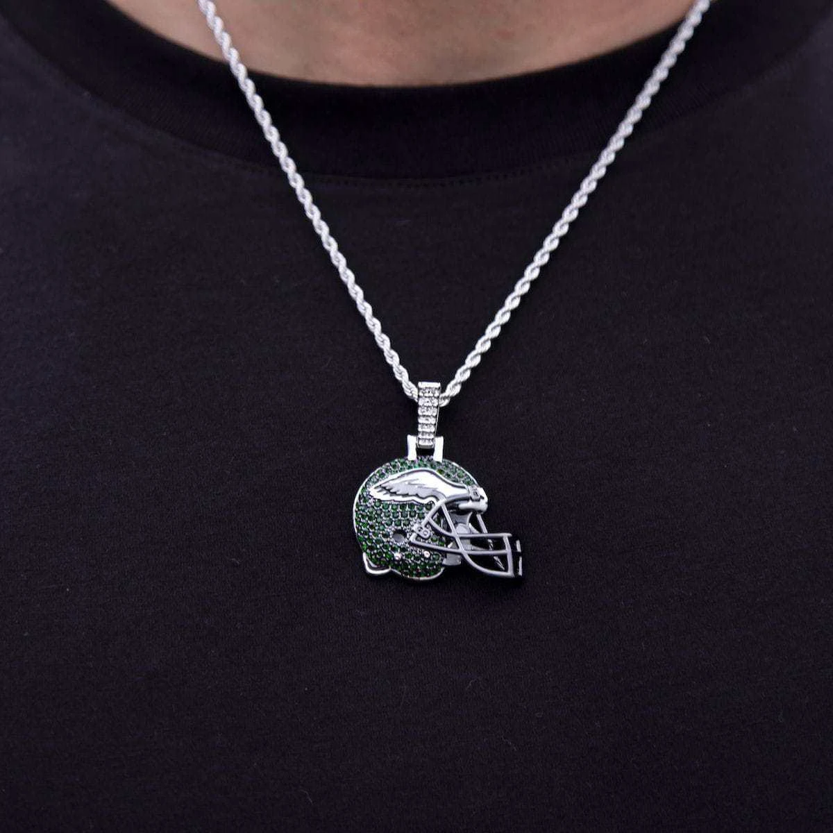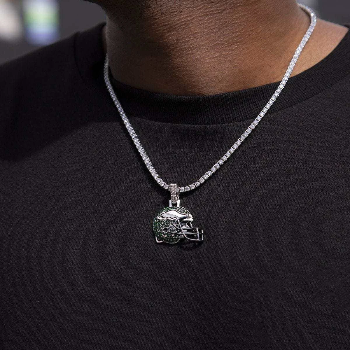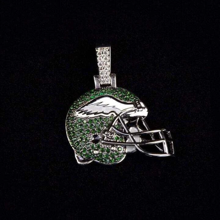 GLD has teamed up with the National Football League to introduce the official NFL Team Helmet Pendants. This piece was meticulously crafted with a green hand-set stones along with gray and white enamel to accurately depict the helmets of the Eagles. Flex this NFL season with the official pendant of the Philadelphia Eagles.