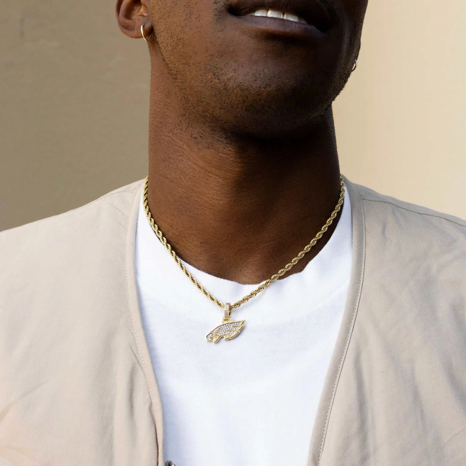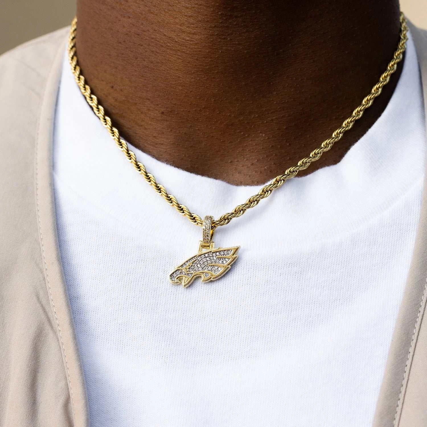 GLD has teamed up with the National Football League to introduce the official NFL Team Pendants. This piece was meticulously crafted with 18k gold and clear hand-set stones to accurately depict the logo of the Eagles. Flex this NFL season with the official pendant of the Philadelphia Eagles.