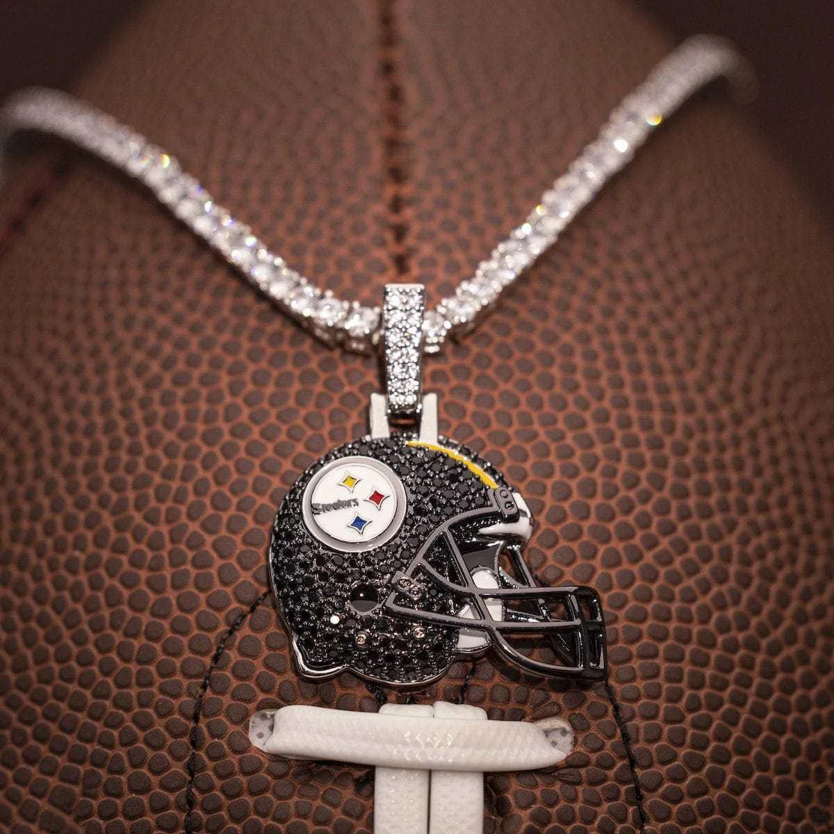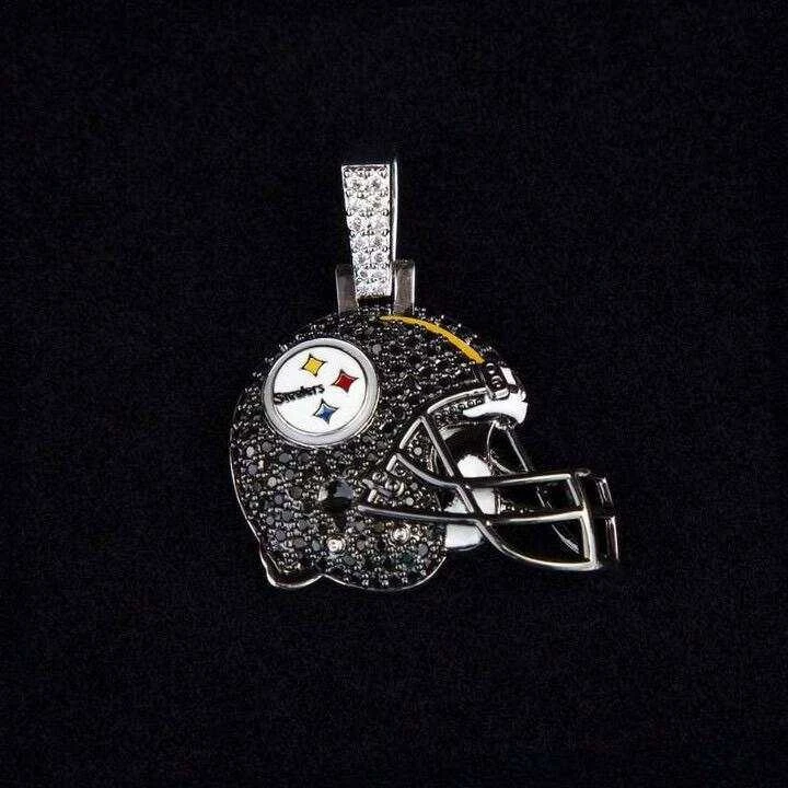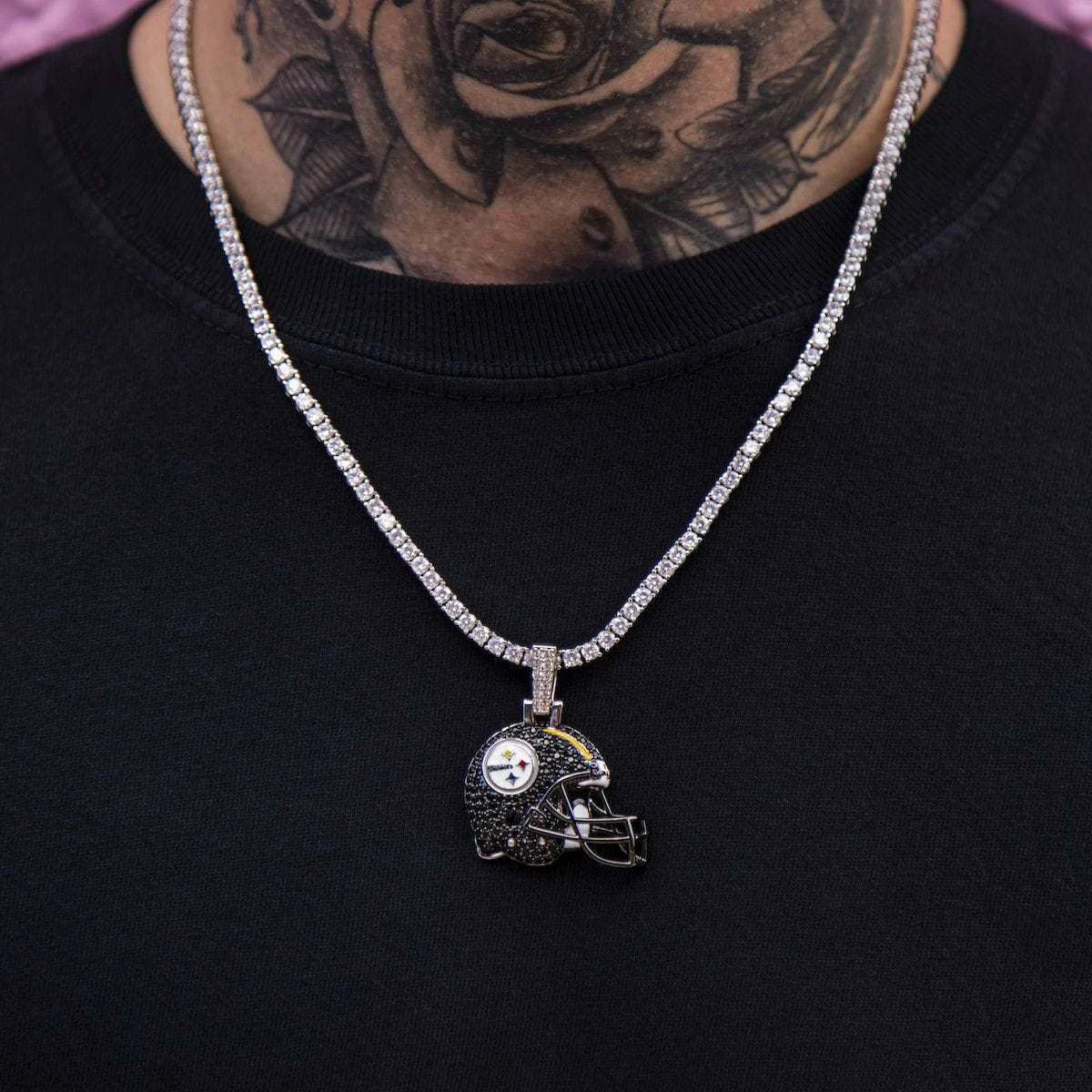 GLD has teamed up with the National Football League to introduce the official NFL Team Helmet Pendants. This piece was meticulously crafted with black hand-set stones and multi colored enamel to accurately depict the helmets of the Steelers. Steelers Country flex this season with the official pendant of the Black and Gold.