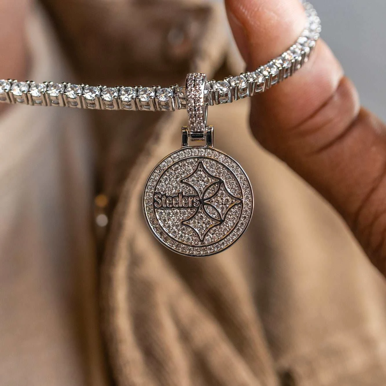 GLD has teamed up with the National Football League to introduce the official NFL Team Pendants. This piece was meticulously crafted with 14K White gold and clear hand-set stones to accurately depict the logo of the Steelers. Flex this season with the official pendant of the Pittsburgh Steelers.