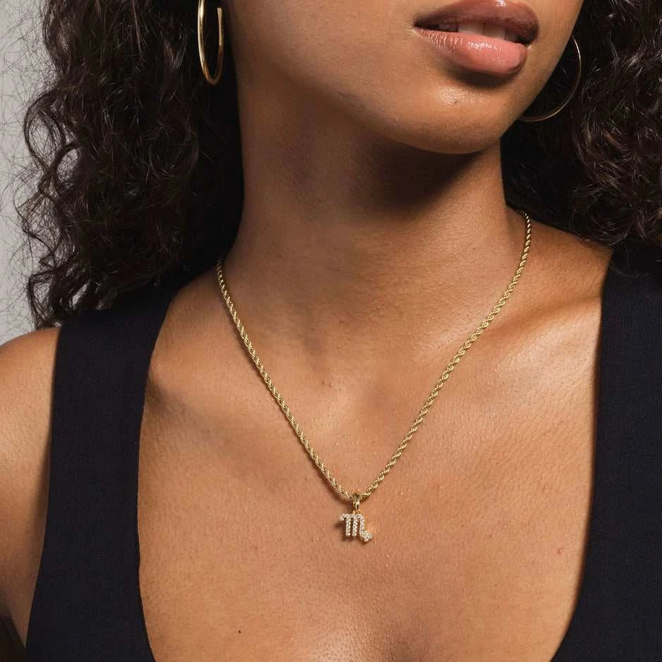 Introducing our “Scorpio Pave Pendant” this small detailed pendant is a great staple for everyday to represent you and your zodiac. The zodiac pave pendants are great for layering, you can even layer 2 zodiacs and support your loved ones. Pair these pendants with our “2mm Rope Chain” featured in the images and create the perfect stack this summer! Scorpio, you are the most intense and passionate water sign in astrology, show that off this summer with a little bit of ice.