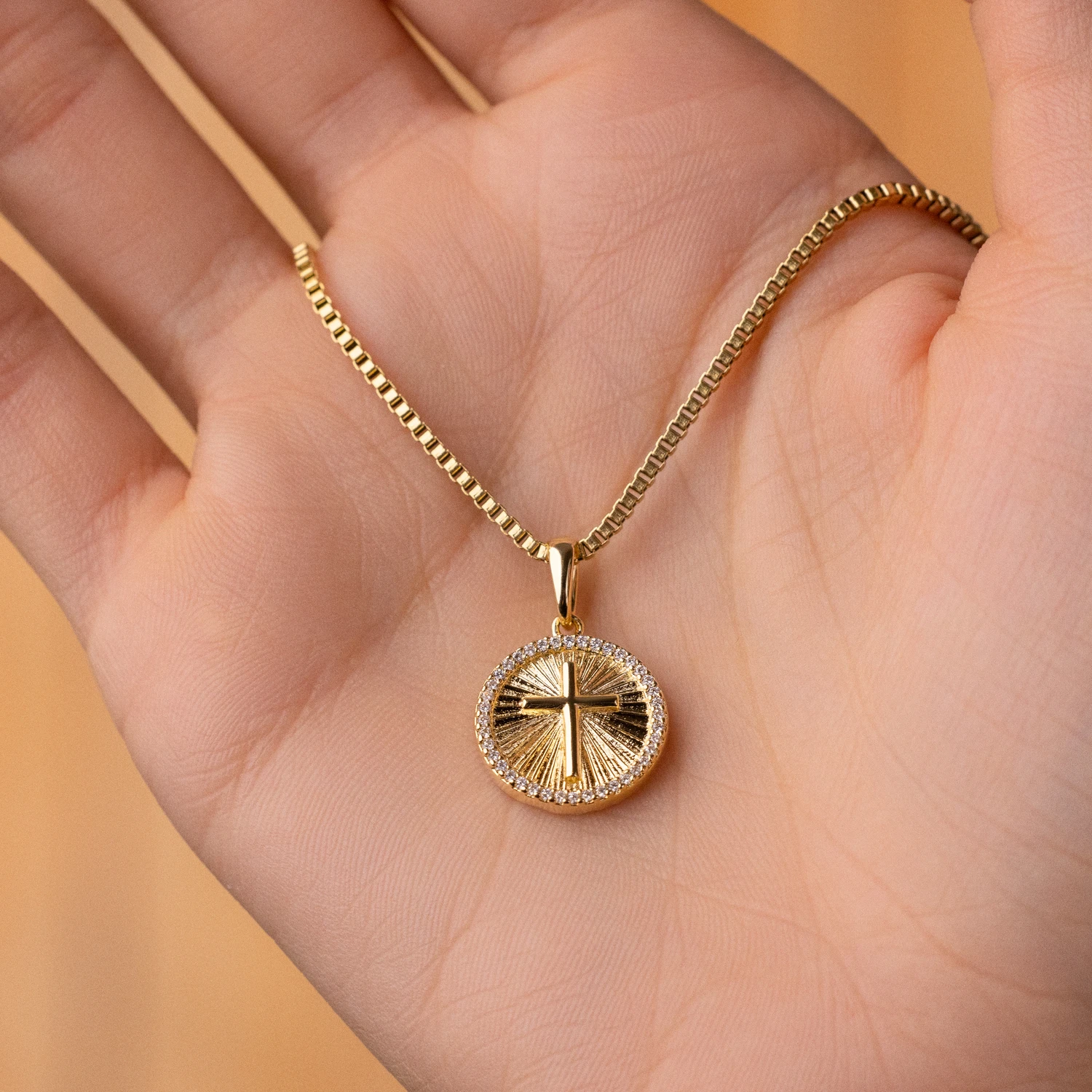 Introducing the Small Cross Coin Pave Pendant. This gold pendant is a great staple piece, you can pair this with any of our classic chains. In this picture we see it is paired with one of our Rope Chains for a classic look that can be worn alone or styled with other layered chains.
