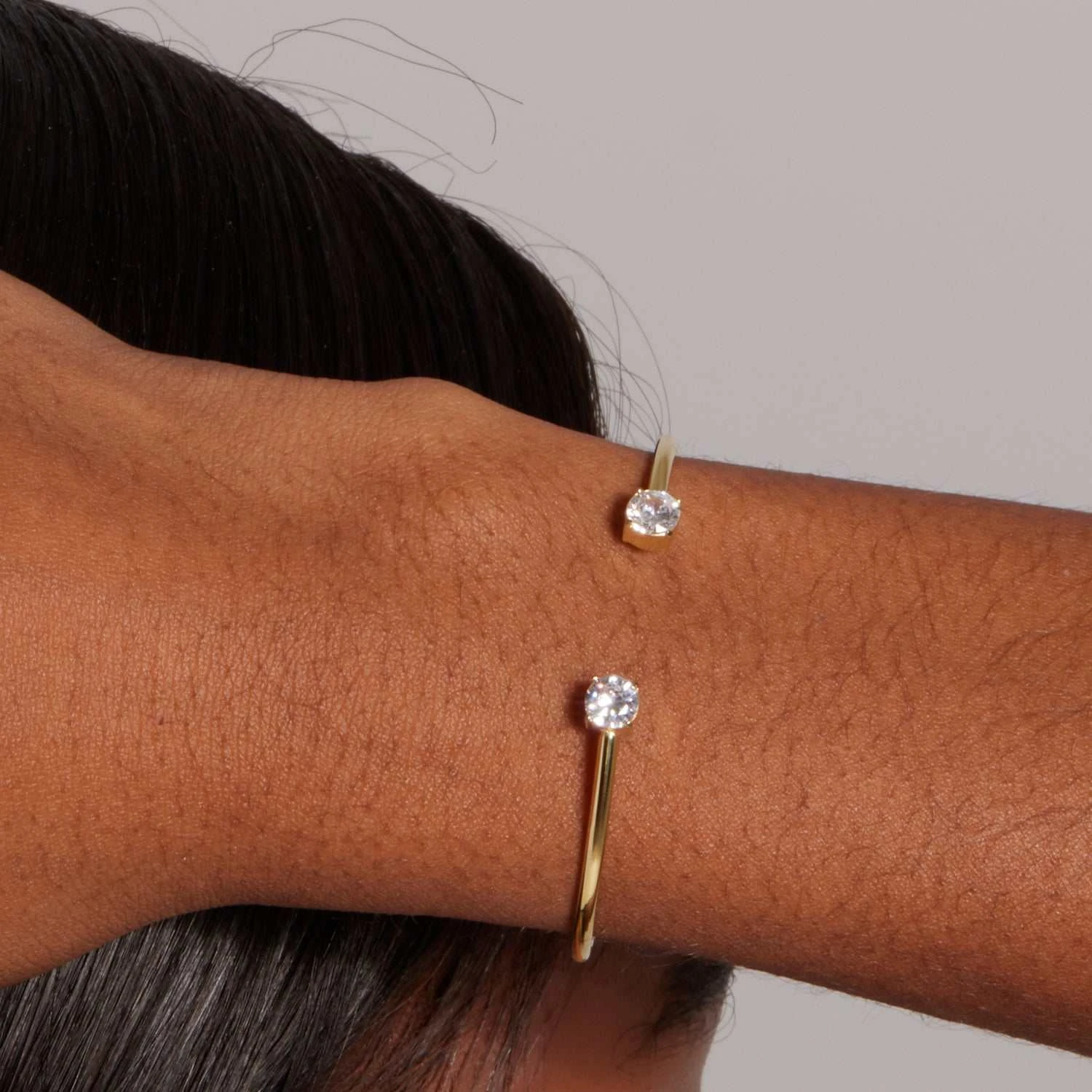 Introducing the Stationed Stone Open Cuff Bracelet, a timeless bracelet that can be styled for any occasion. This gold plated piece features two stones on the opening of the cuff for some extra shine. Paired with the Open Cuff Bracelet with Round Cut Stones, they make a beautiful stack!